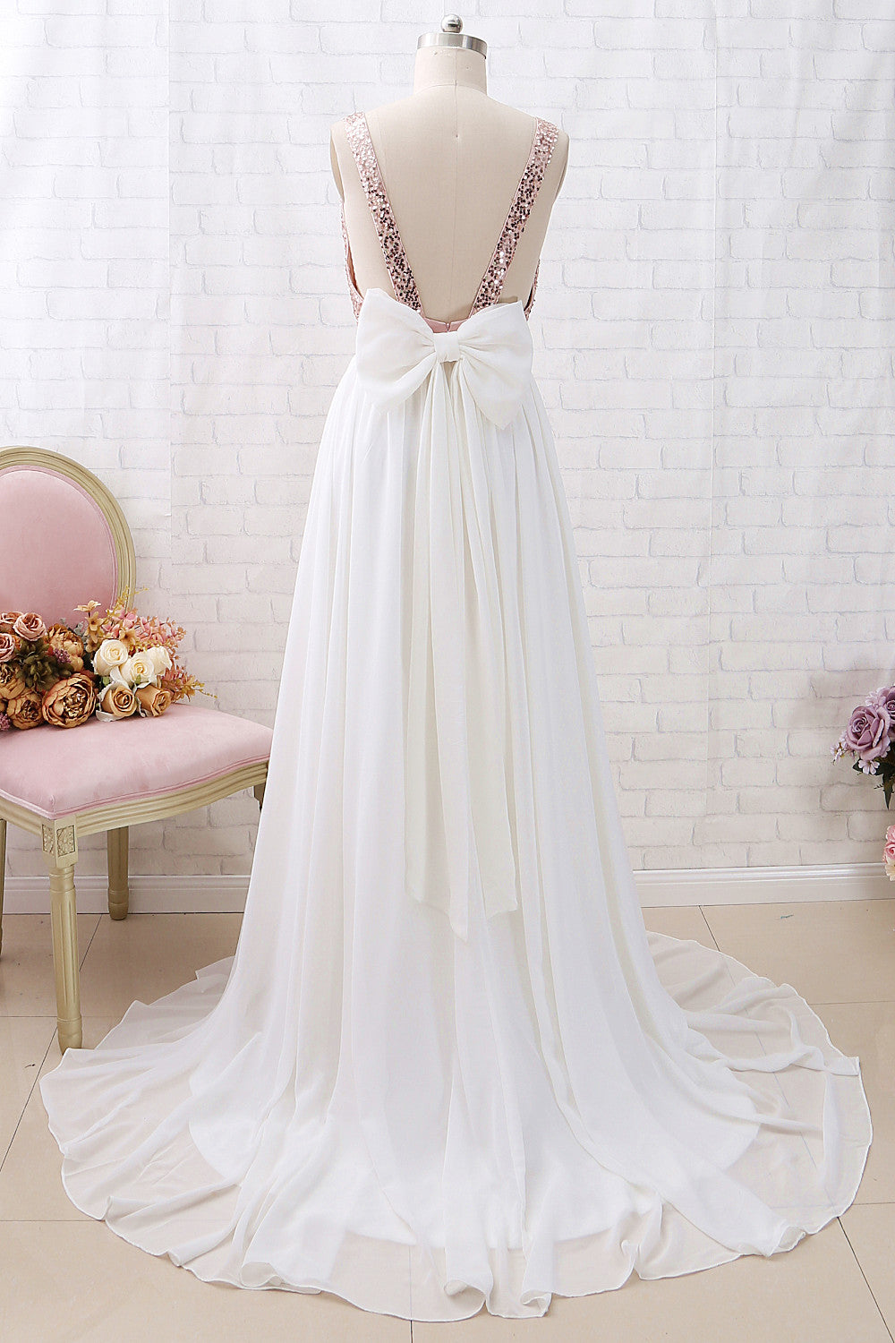 Vestido de fiesta largo de gasa con lentejuelas y escote en V con tirantes MACloth, vestido de noche formal en oro rosa