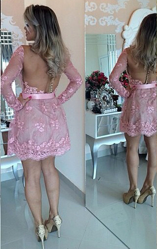 Vestido de fiesta de bienvenida con encaje y escote en V y mangas largas de MACloth, vestido de noche formal rosa