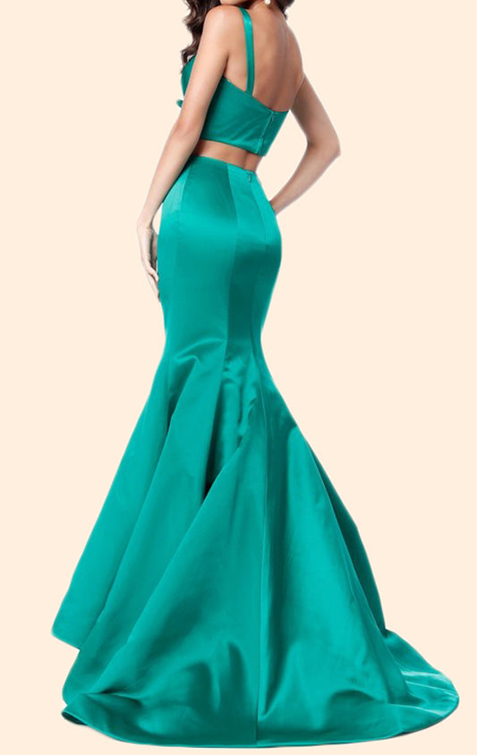 Vestido de fiesta largo de satén de 2 piezas con escote sirena de MACloth, vestido de noche formal azul
