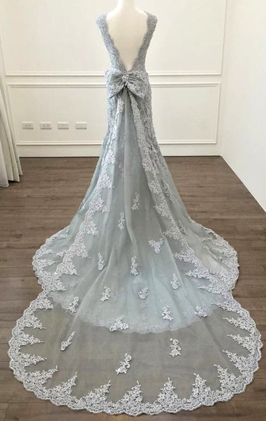 Vestido de fiesta largo de encaje con escote redondo y sirena de MACloth, vestido de noche formal plateado 10800