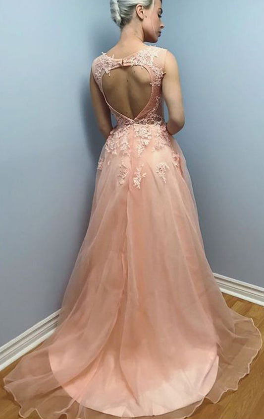 Vestido de fiesta largo de organza con escote en V y tirantes MACloth en color melocotón