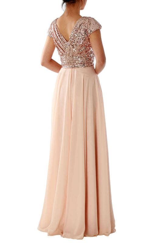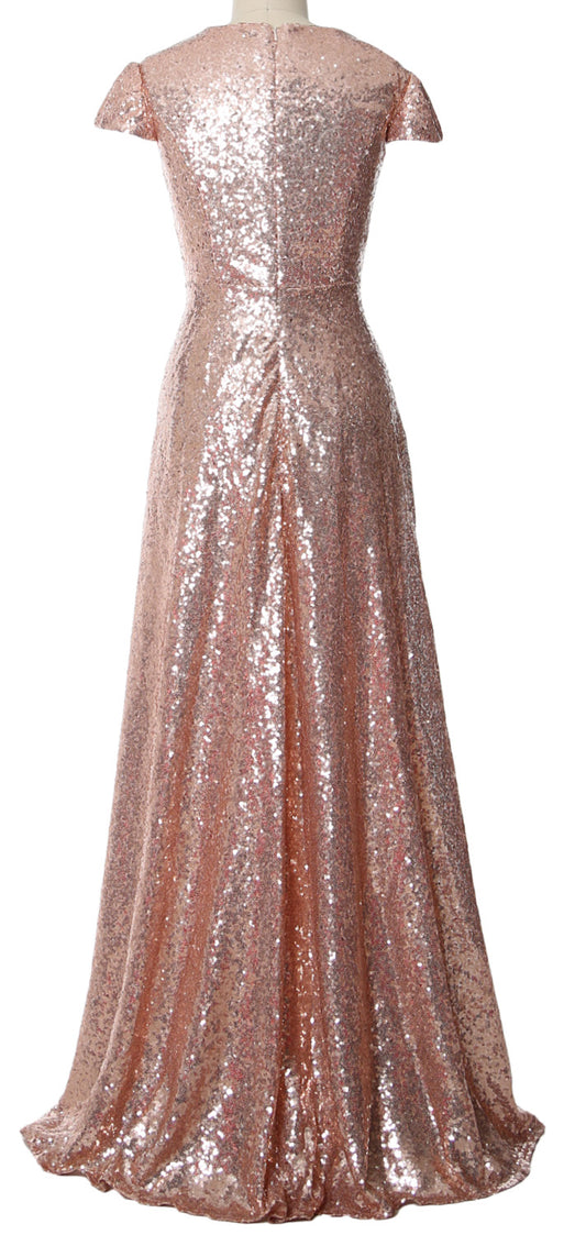 Vestido de dama de honor de gasa con lentejuelas, escote en V y mangas cortas en oro rosa