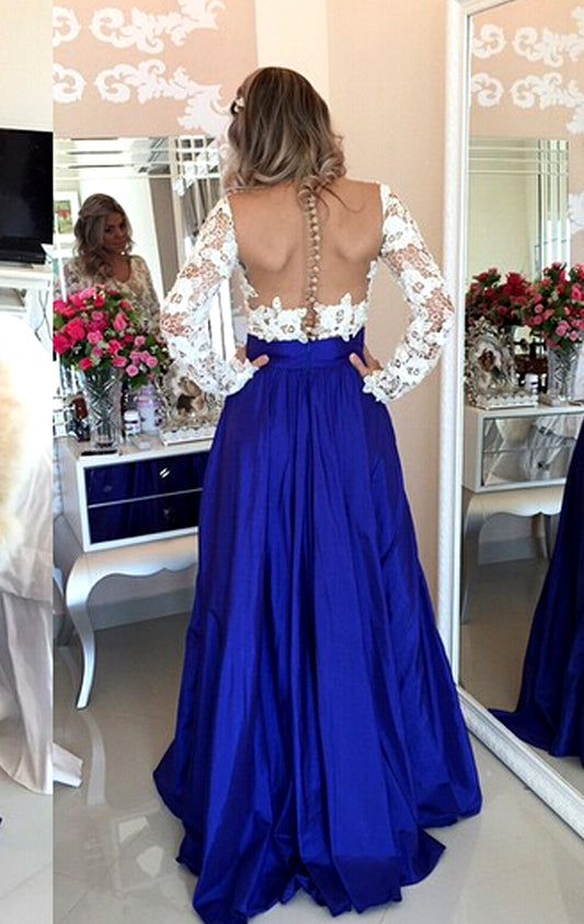 Vestido de fiesta largo de gasa con encaje y mangas largas con escote en V de MACloth, vestido de noche formal azul real