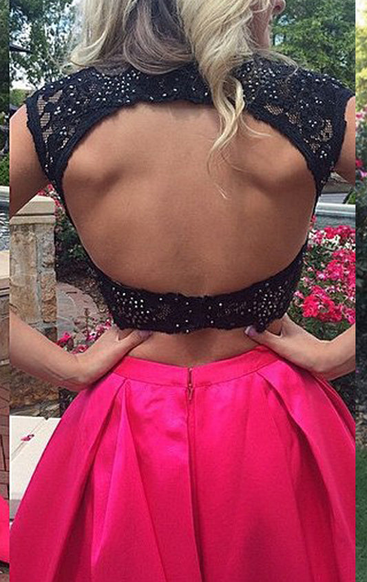 Hermoso vestido de fiesta largo de encaje fucsia de 2 piezas con escote en V de MACloth