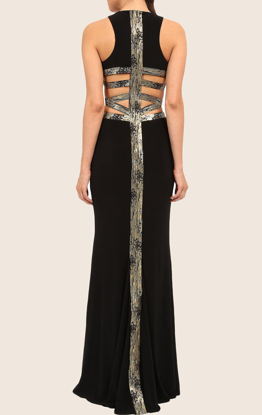 Vestido de fiesta de tafetán con lentejuelas negras, escote redondo, tirantes finos y corte asimétrico de MACloth