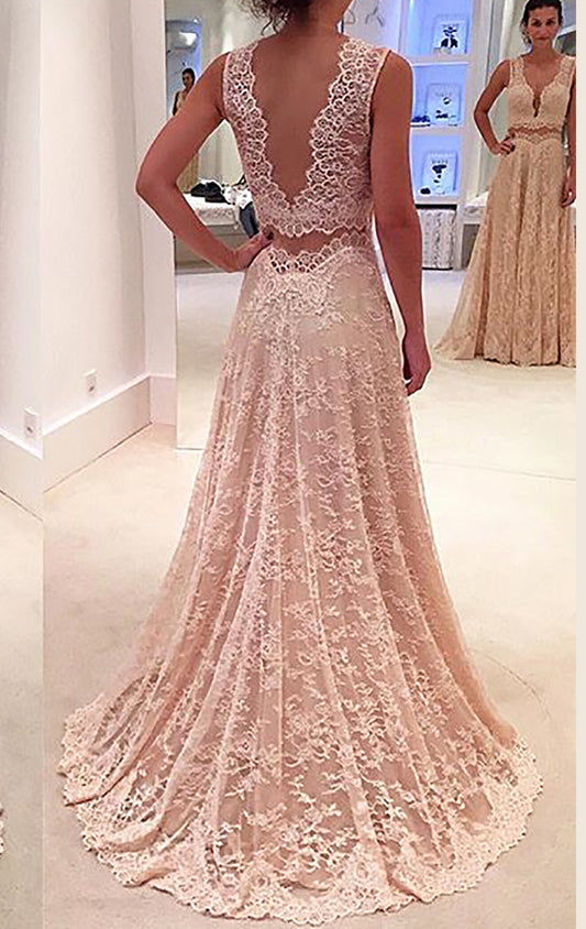 Vestido de fiesta formal largo de encaje con escote en V de dos piezas de MACloth