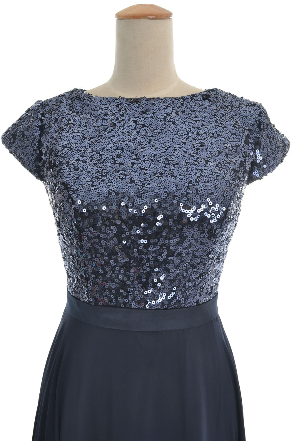 El corpiño de lentejuelas presenta un escote barco y una abertura en la espalda. La falda hasta el suelo con cinturilla a tono favorece a cualquier figura.