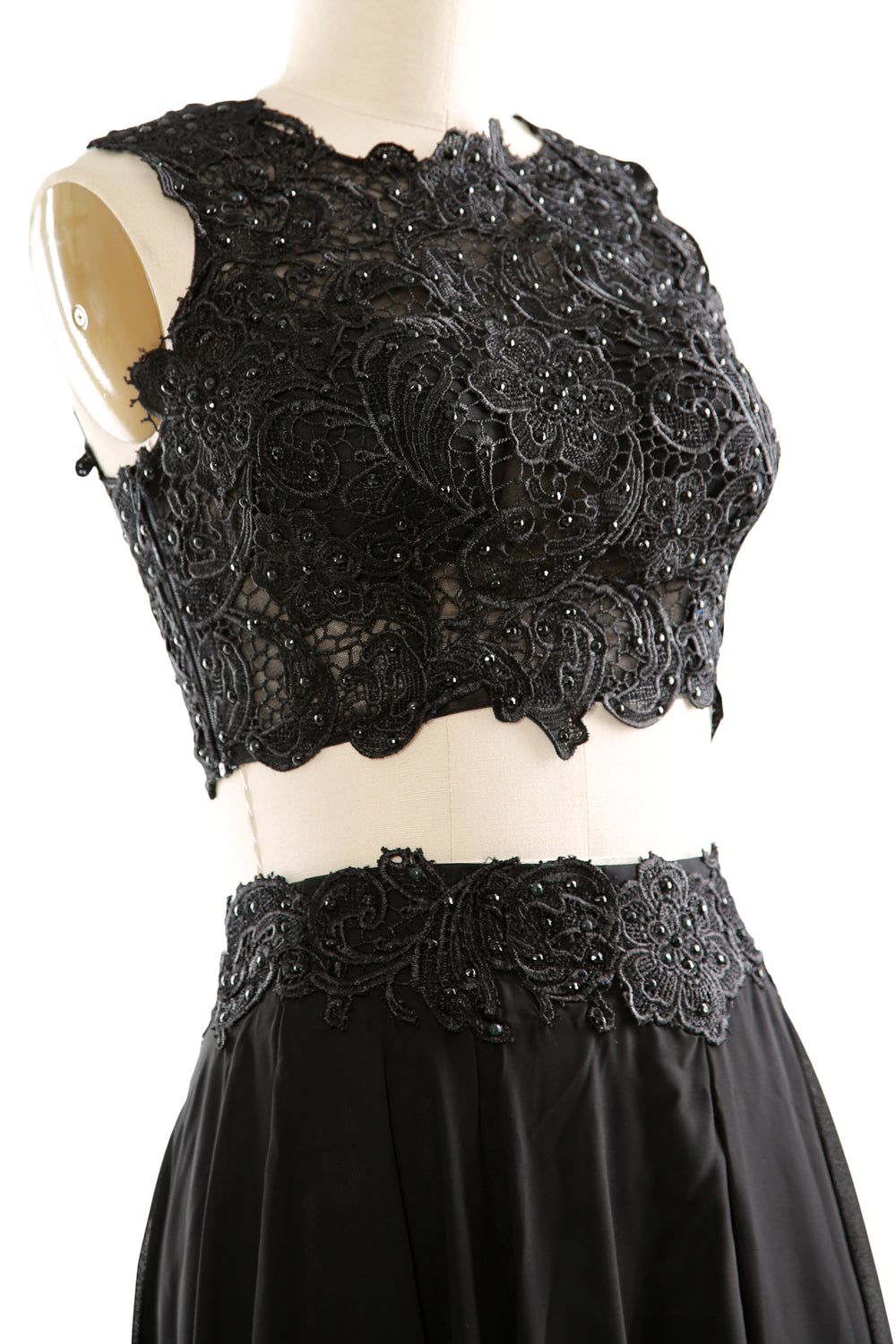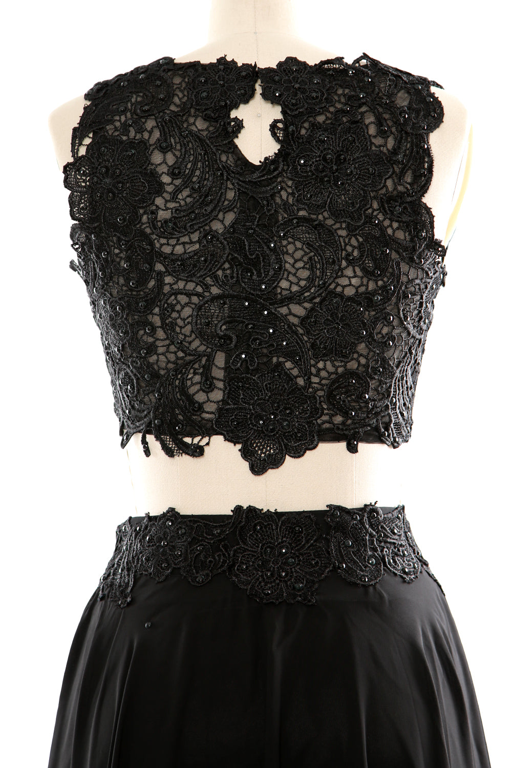 El top corto está compuesto por un rico encaje sobre el corpiño. La falda hasta la rodilla está rematada con un encaje de cuentas a juego que remata la cintura.