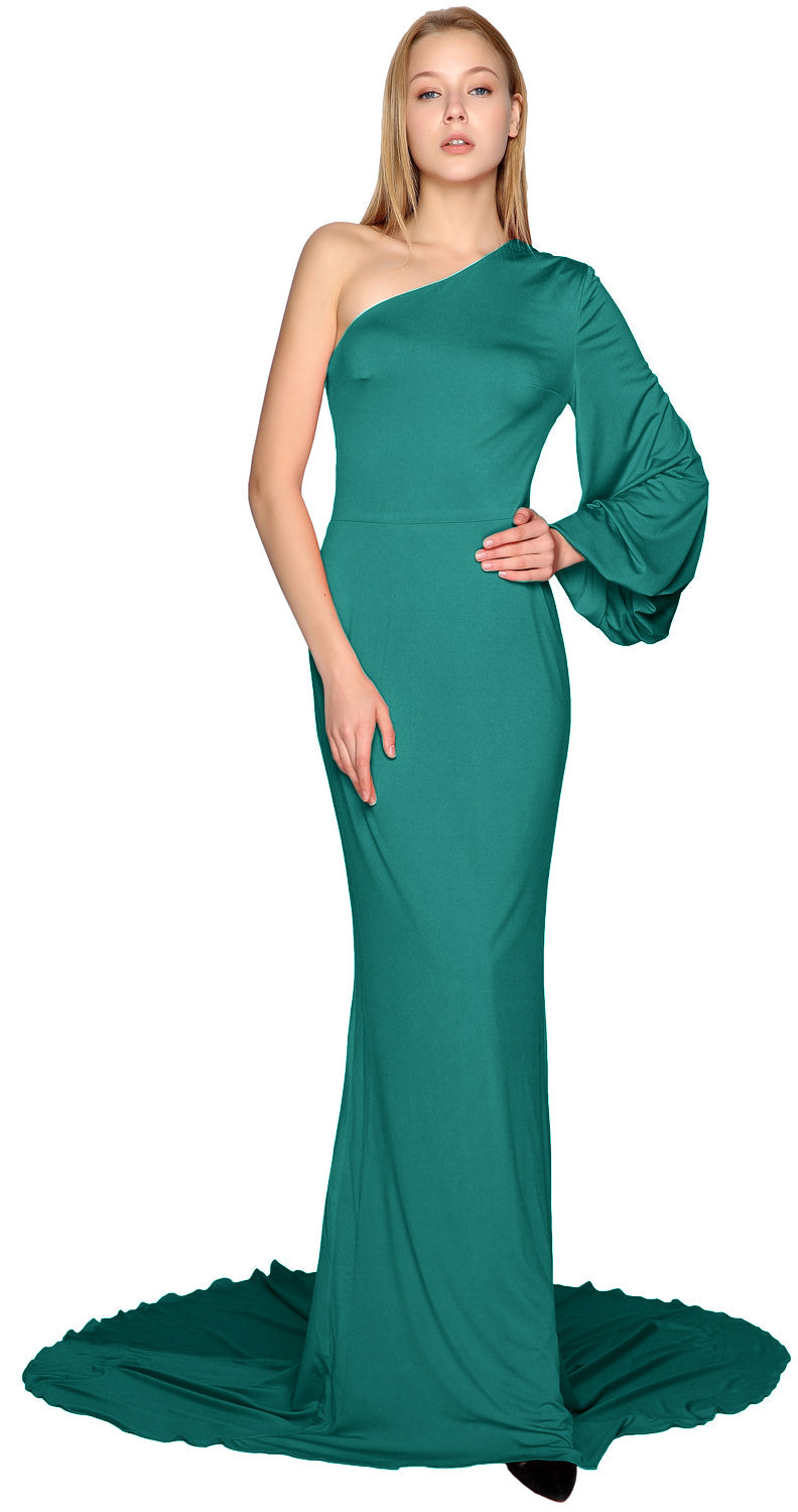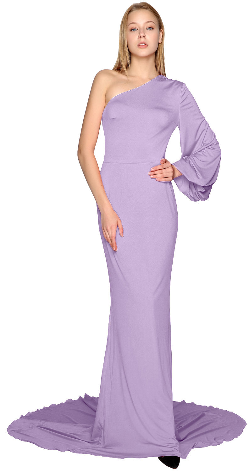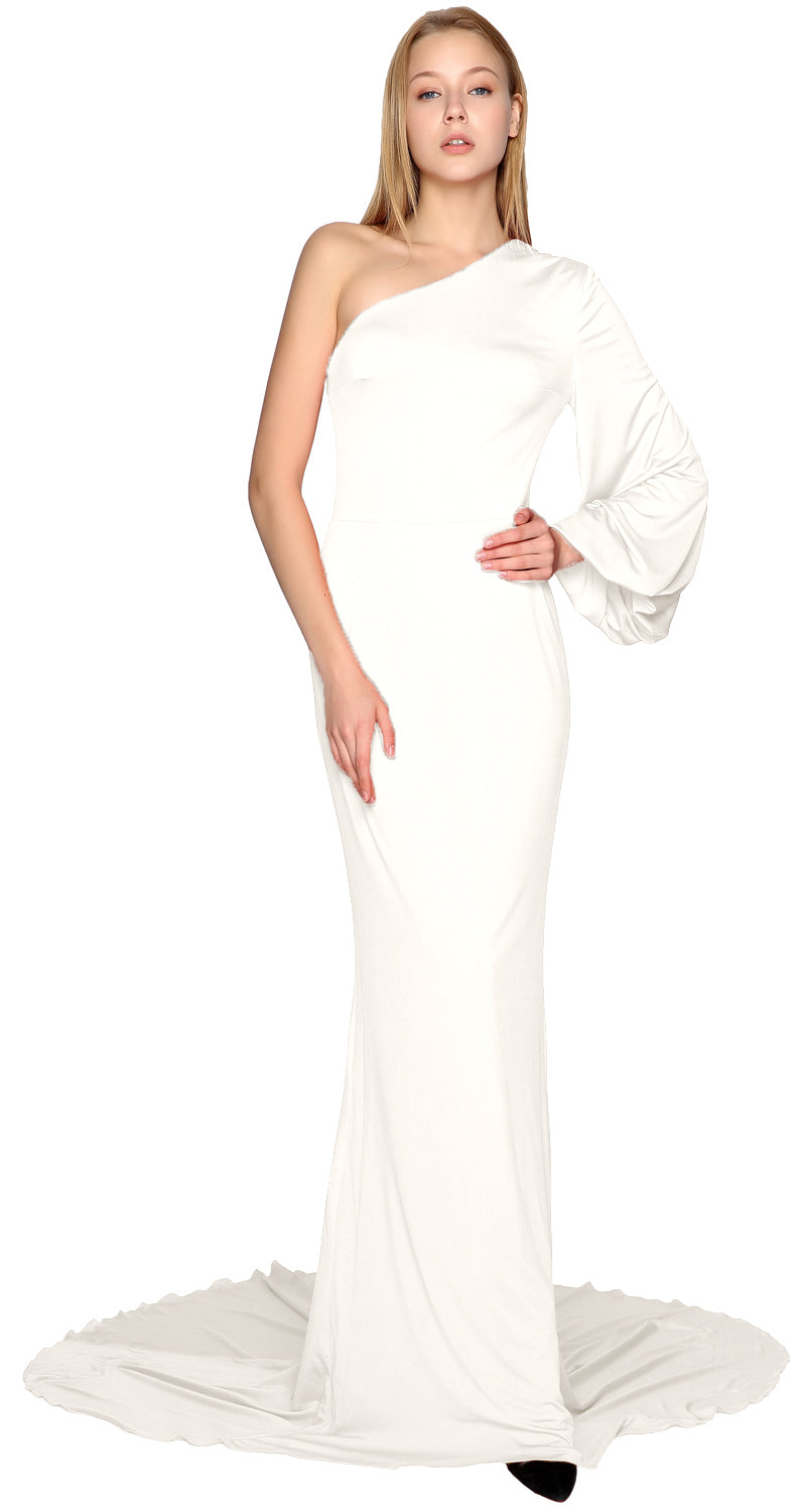 Baila con estilo toda la noche. Este encantador vestido de noche presenta un escote asimétrico con un solo hombro y una manga suelta. La falda de jersey cae hasta el suelo. La silueta ceñida al cuerpo con una cola amplia crea un atractivo sensual.