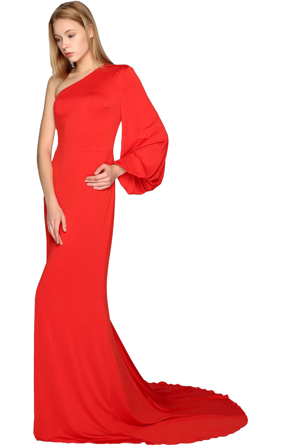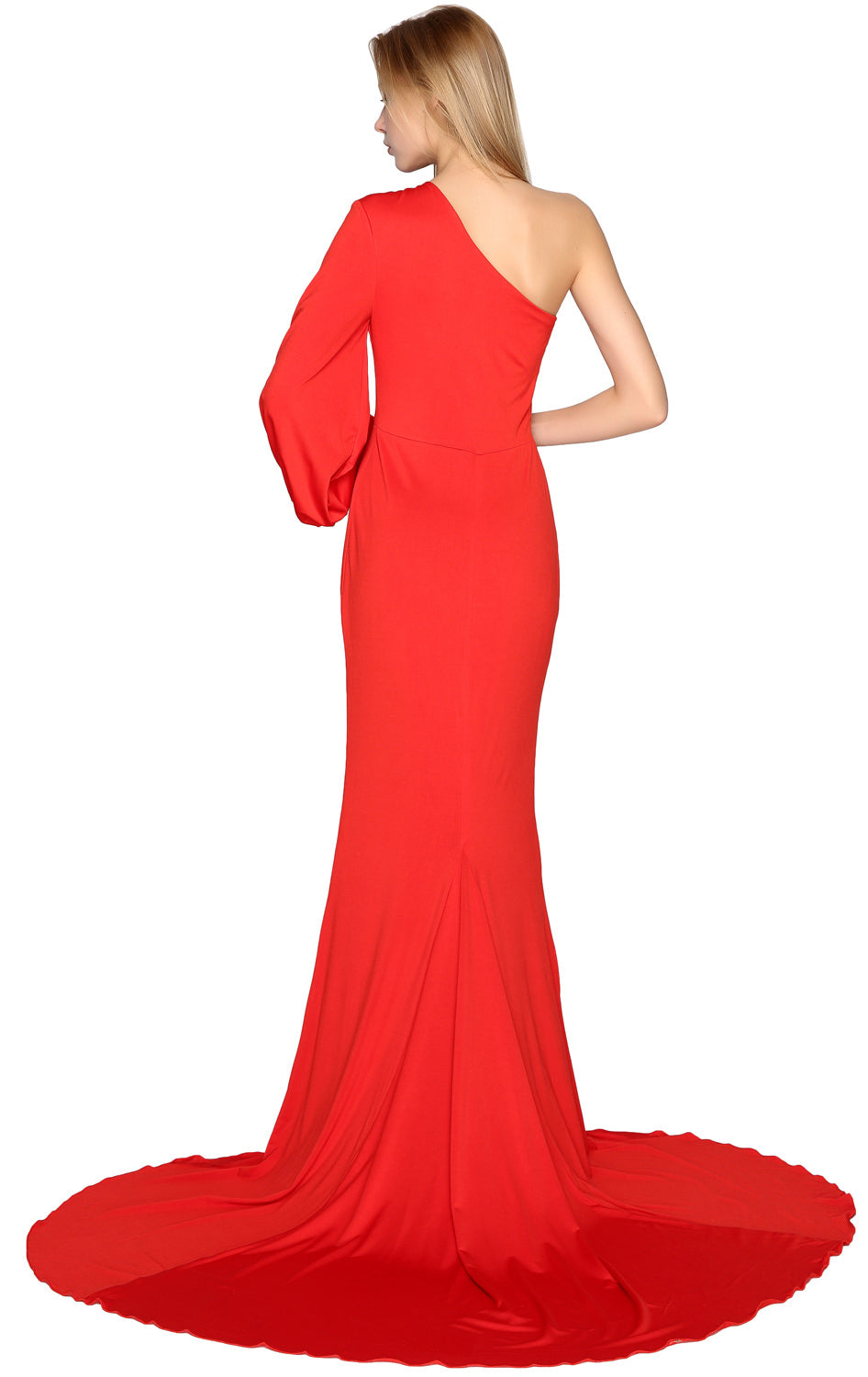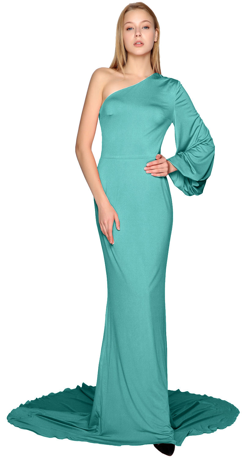 Baila con estilo toda la noche. Este encantador vestido de noche presenta un escote asimétrico con un solo hombro y una manga suelta. La falda de jersey cae hasta el suelo. La silueta ceñida al cuerpo con una cola amplia crea un atractivo sensual.