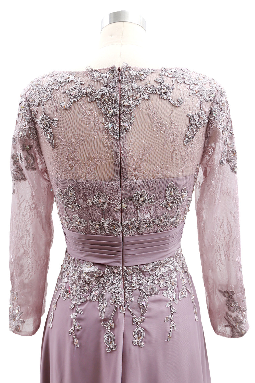 Este vestido para la madre de la novia es otra propuesta tradicional para mamá. Su corpiño y mangas de encaje son hermosos y modestos. El fruncido en la cintura brinda cobertura para la zona del abdomen. Escote en V; Mangas largas; Encaje; Largo hasta el suelo; Con relleno; Gasa; Servicio de talla personalizada disponible.