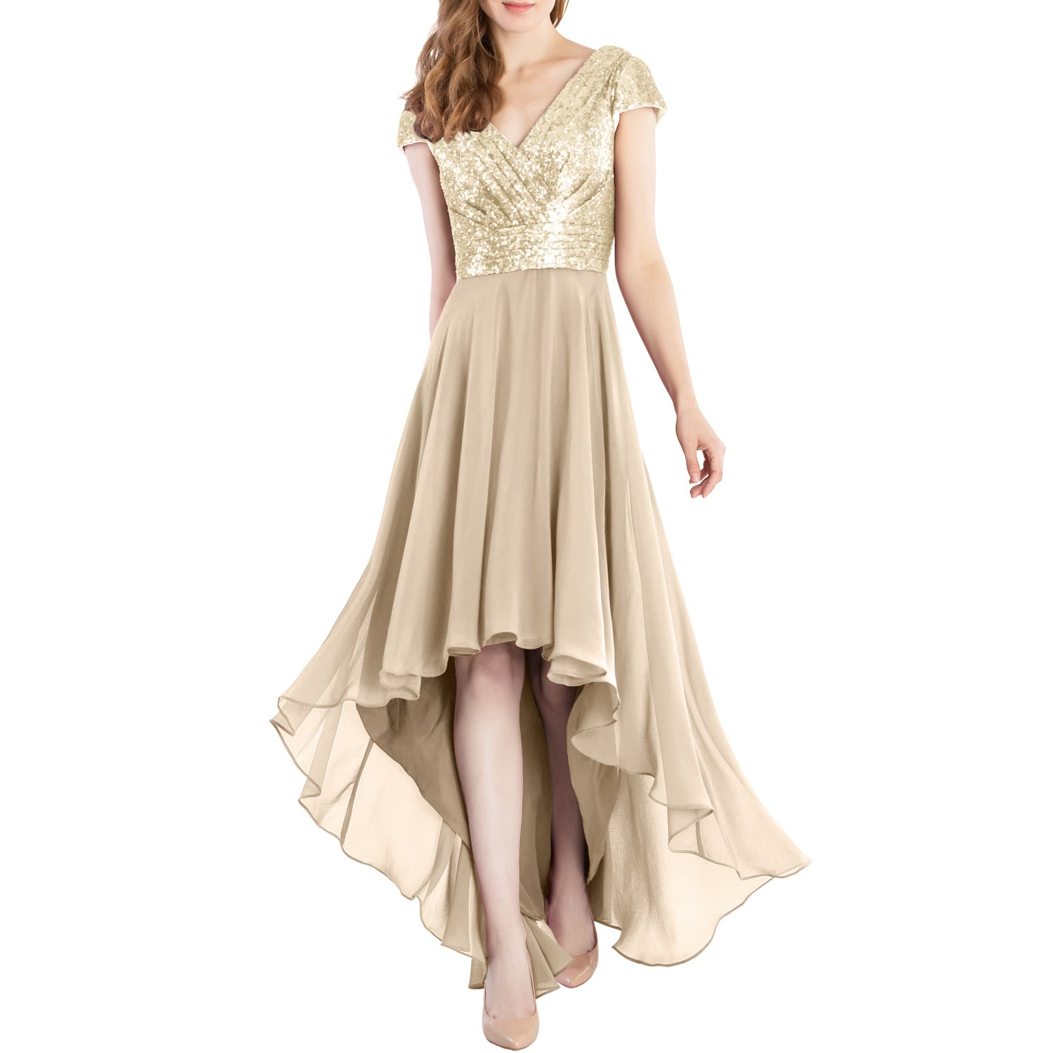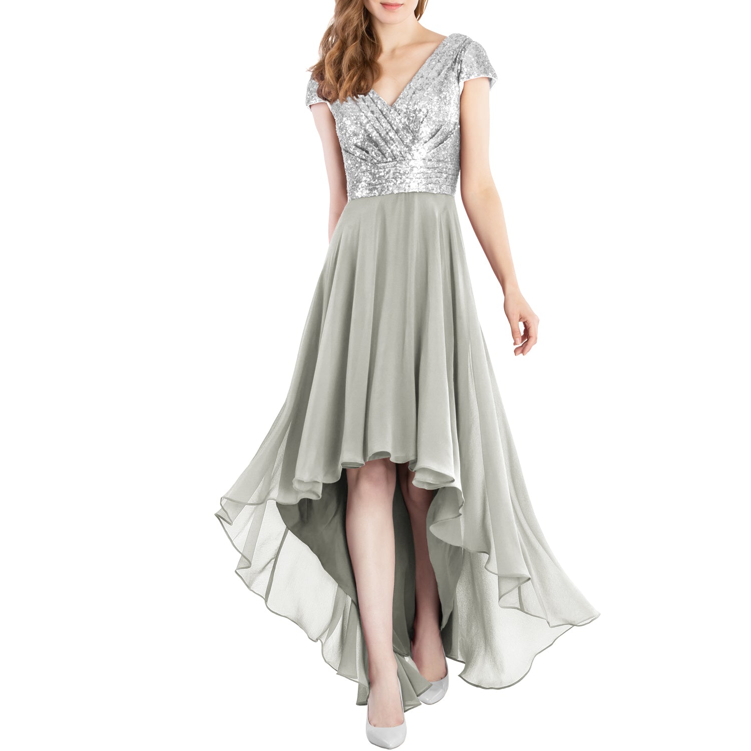 Este modesto vestido de dama de honor presenta un corpiño de lentejuelas plisado con mangas cortas; con un largo coqueto hasta la rodilla en la parte delantera, la falda cae en cascada gradualmente hasta una longitud larga y elegante en la parte trasera. Para un estilo vanguardista en el baile de graduación, una celebración de bodas u otro evento especial.