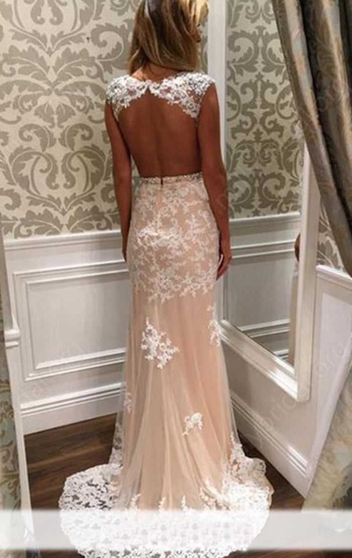 Vestido de fiesta largo de encaje con mangas cortas de MACloth, vestido de noche formal color marfil