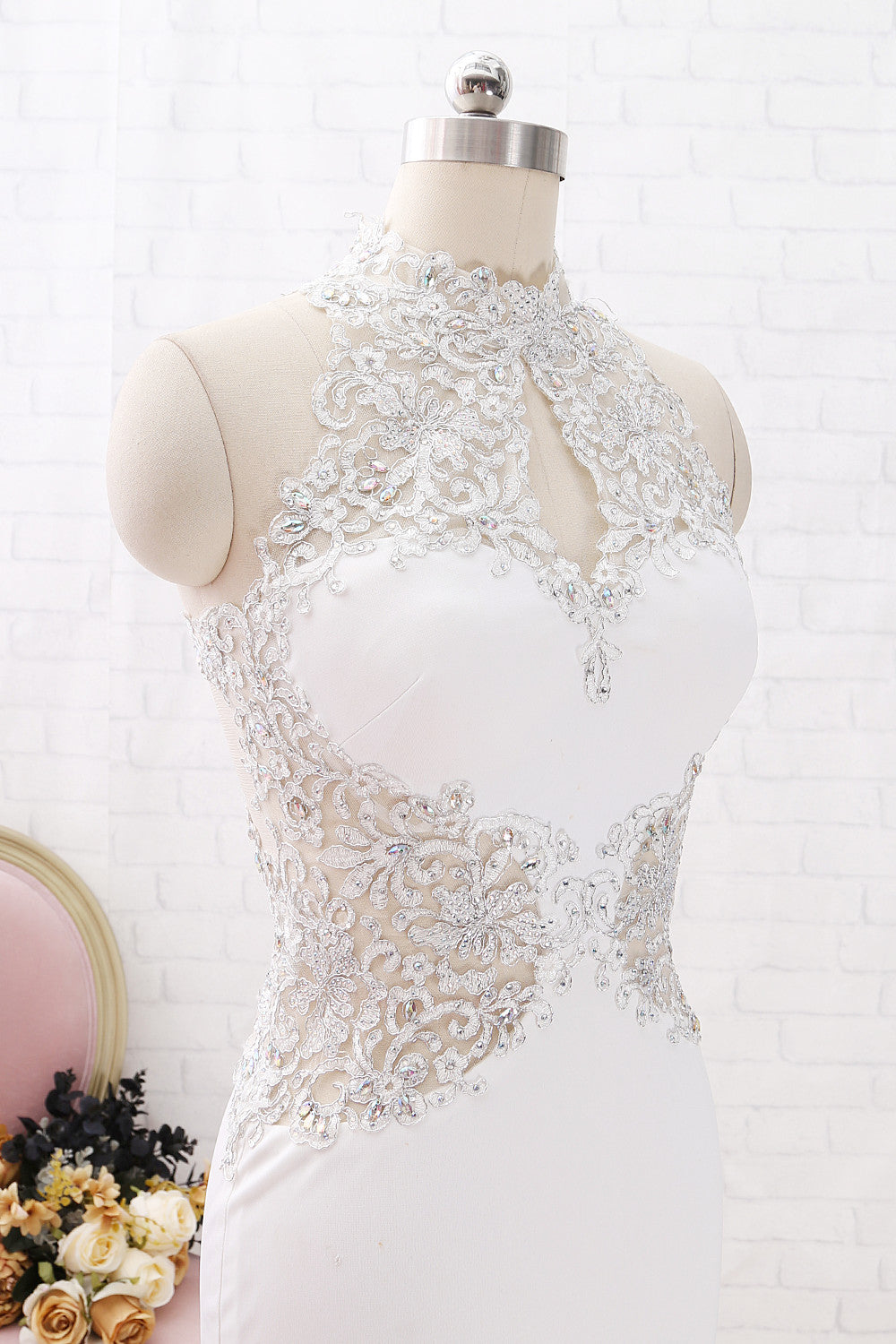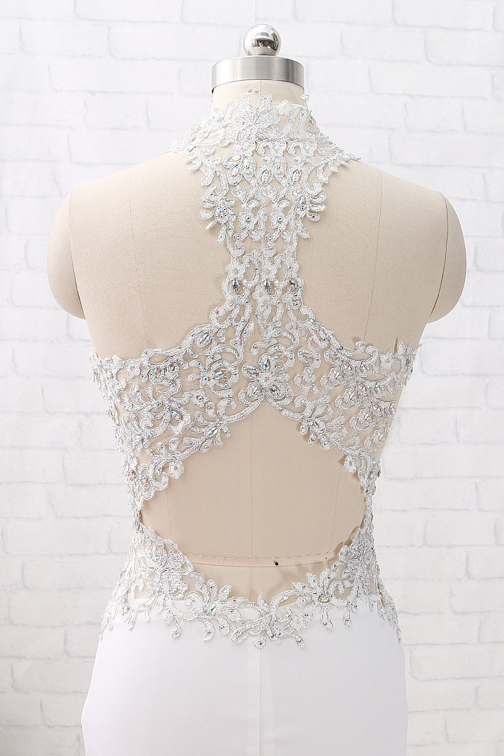 Vestido de fiesta largo de jersey de encaje con cuello alto y escote halter de sirena de MACloth, vestido de noche formal color marfil
