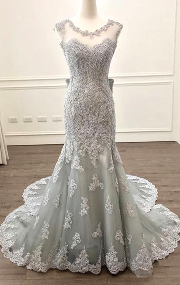 Vestido de fiesta largo de encaje con escote redondo y sirena de MACloth, vestido de noche formal plateado 10800
