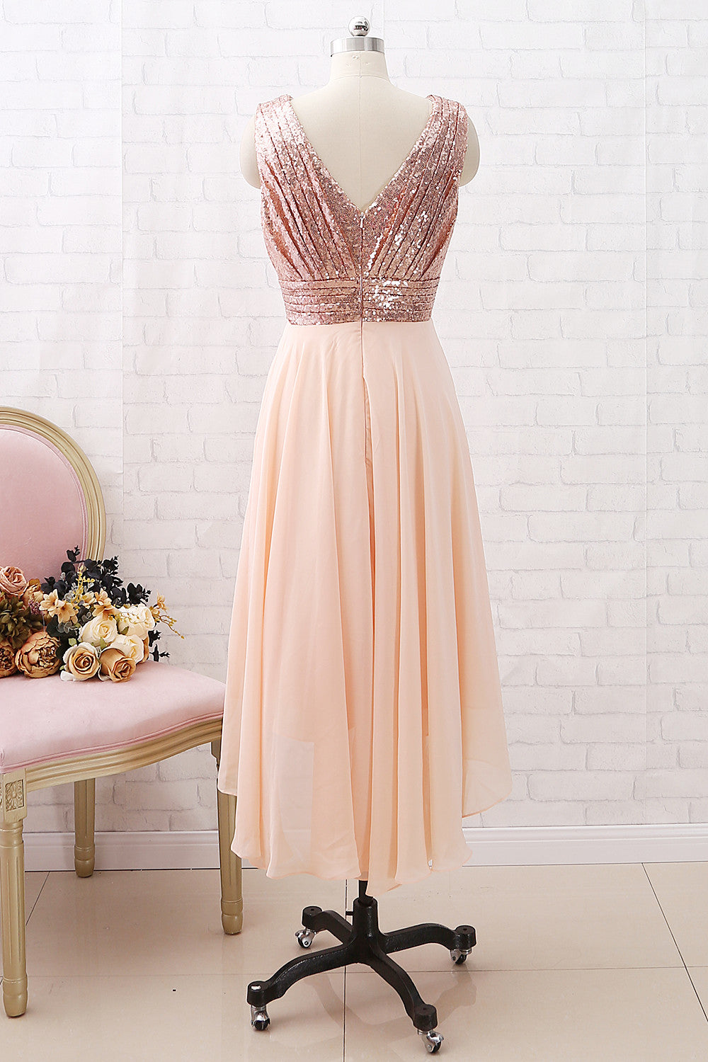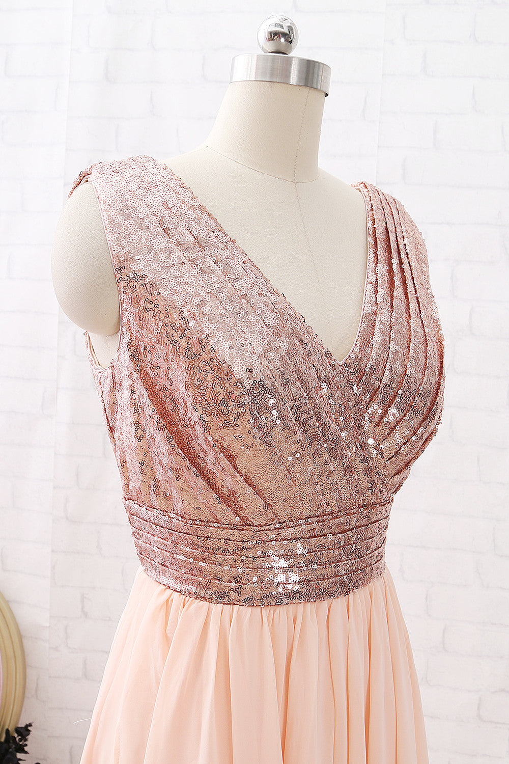 Vestido de dama de honor de gasa con lentejuelas, escote en V y tirantes MACloth, color oro rosa