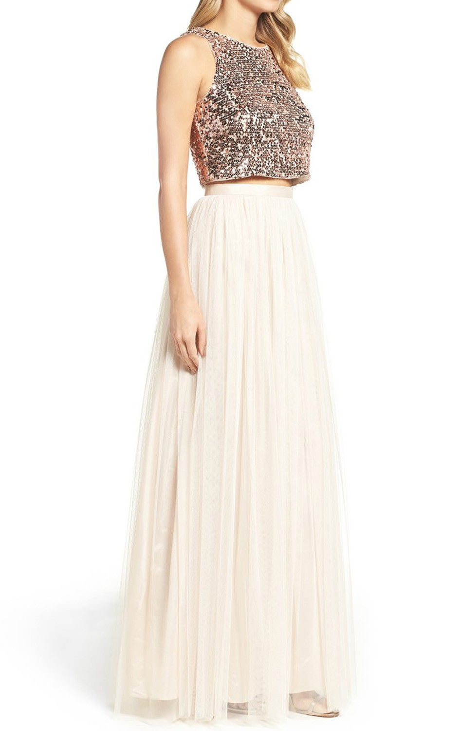 Vestido de dama de honor de dos piezas con lentejuelas de MACloth, vestido formal de fiesta de oro rosa