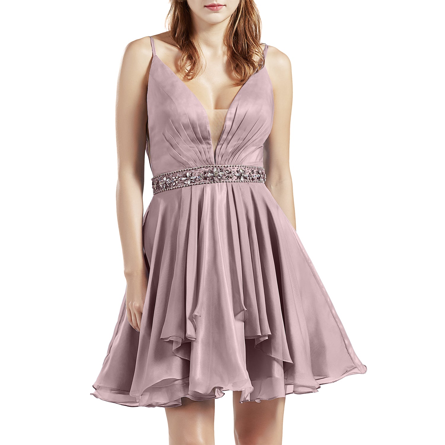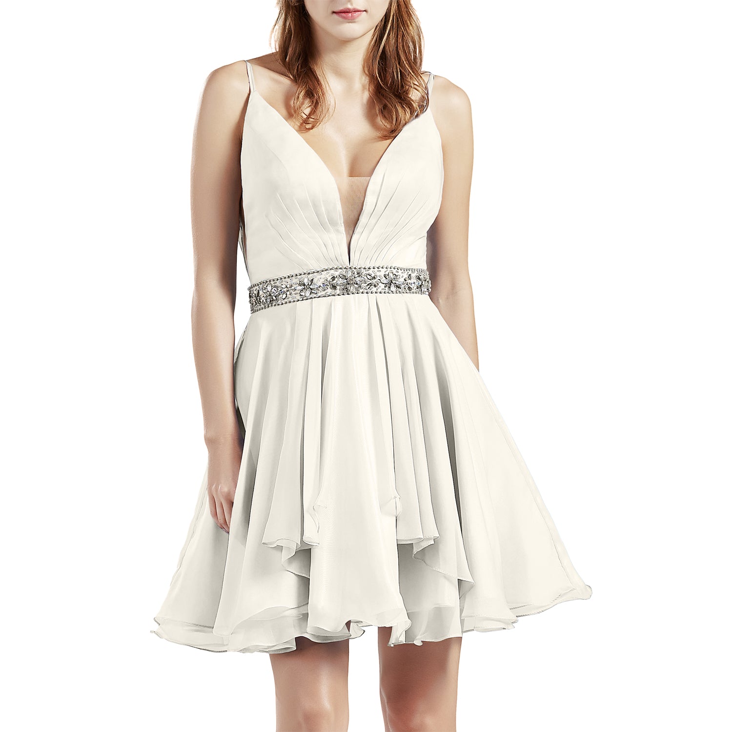 Here is a short semi-formal chiffon party dress for prom or sweet-sixteen celebrations; This adorable dress features an V neck bodice. The banded waistline, adorned with a delightful pattern of sparkling jewels, crowns the short skirt that ends with a curly hemline; Semi-formal; Prom; Homecoming; Pageant; Cocktail.