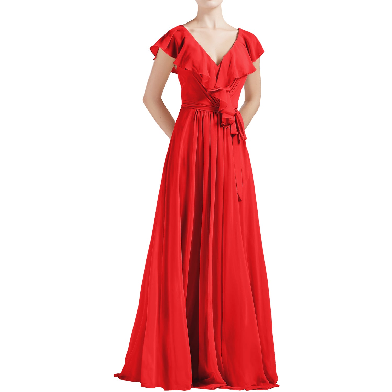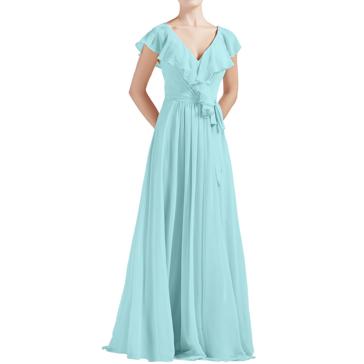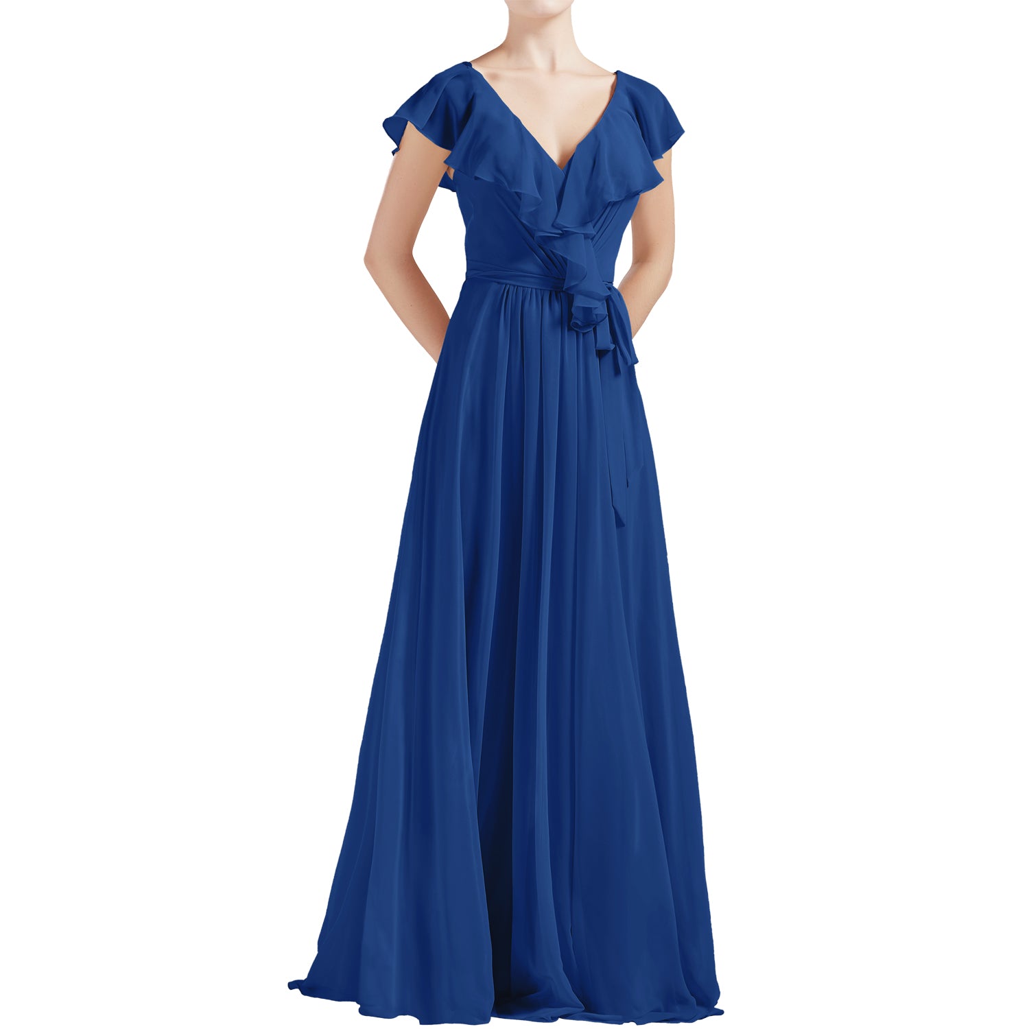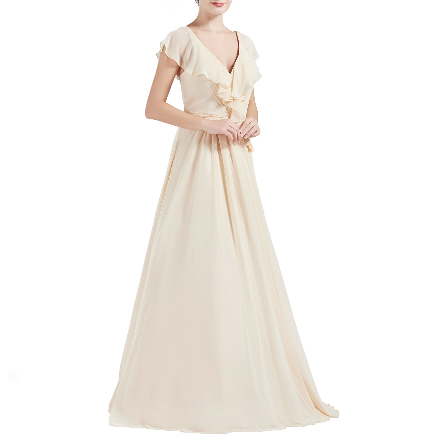 MACloth Women V Neck Ruffle Cap Sleeves Long Bridesmaid Dresses