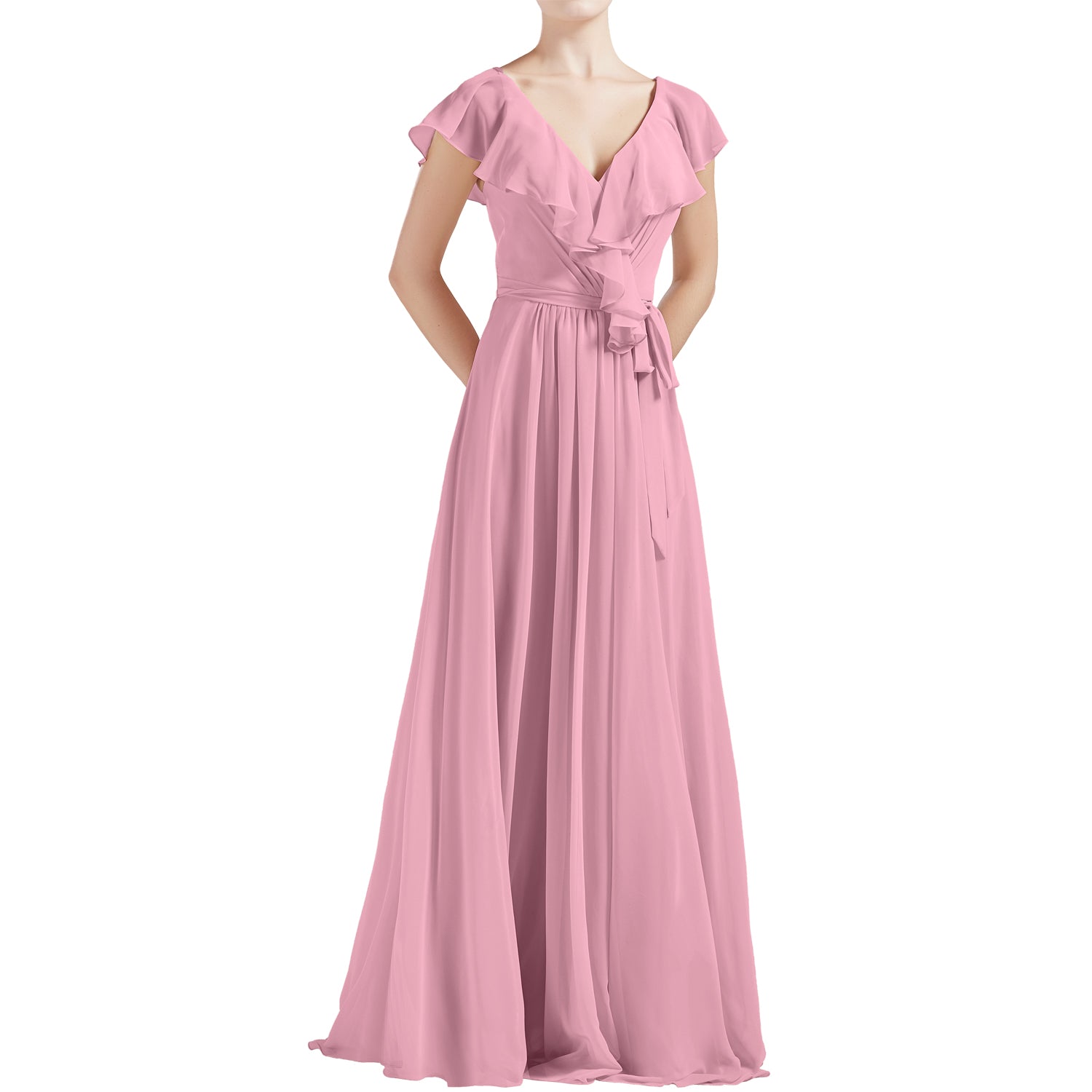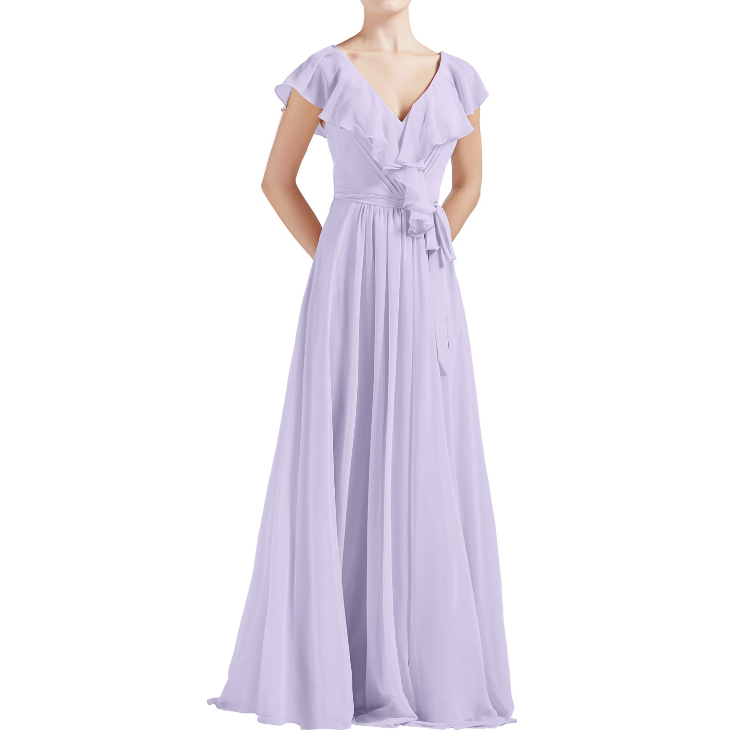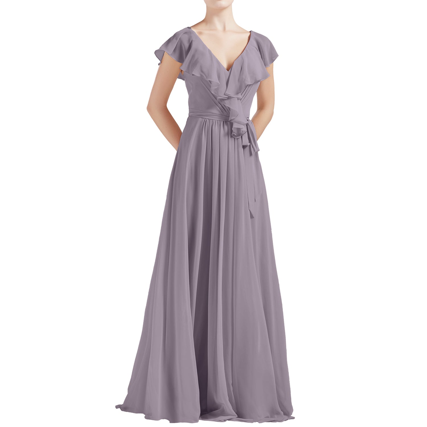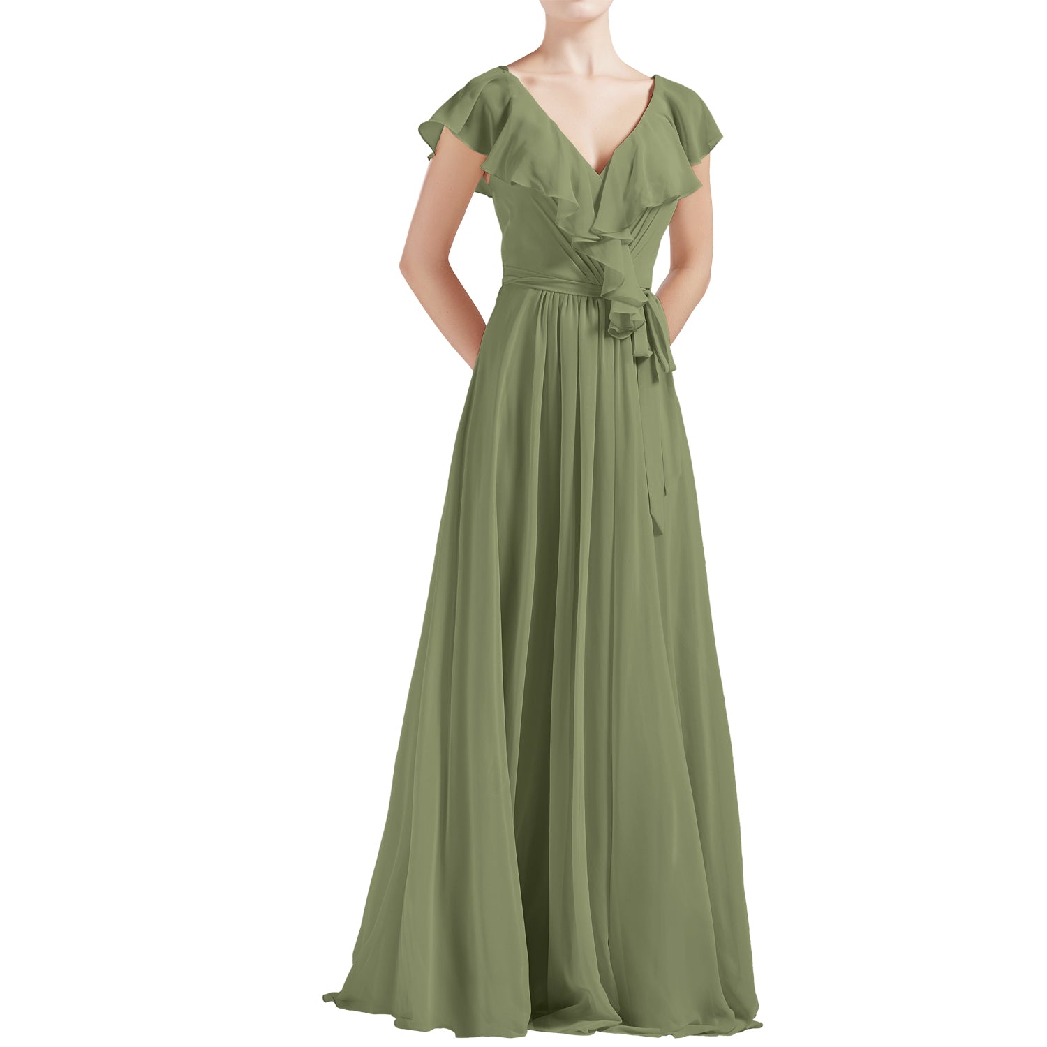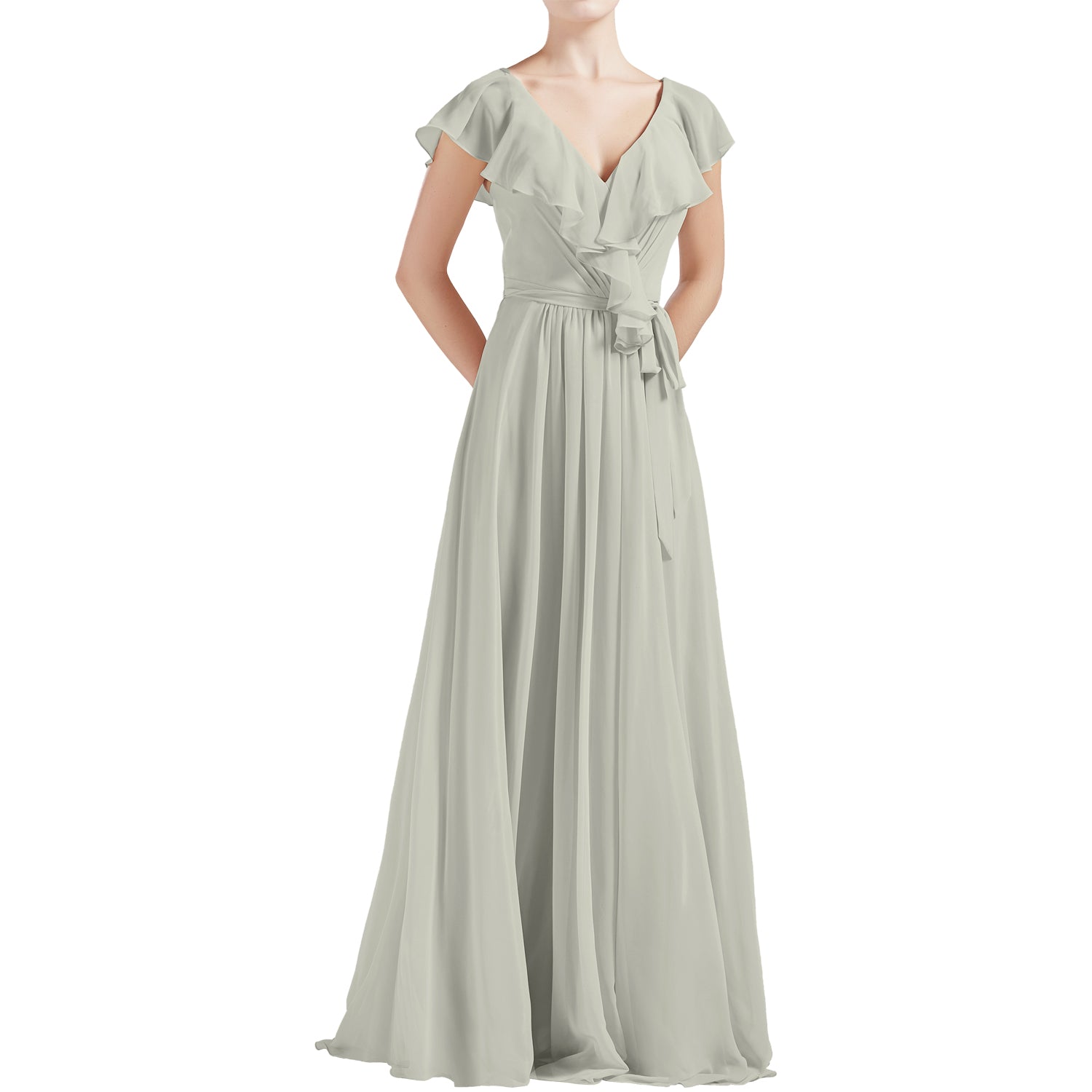 MACloth Women V Neck Ruffle Cap Sleeves Long Bridesmaid Dresses