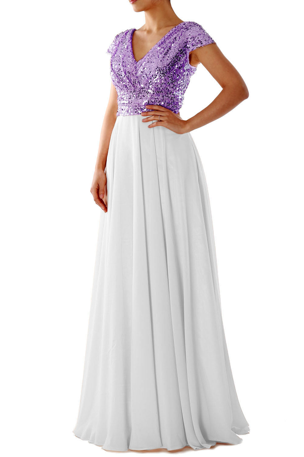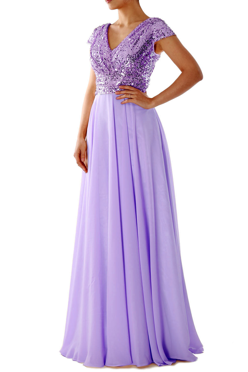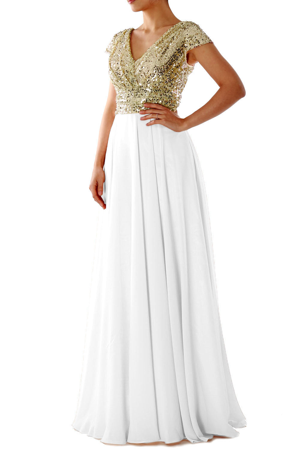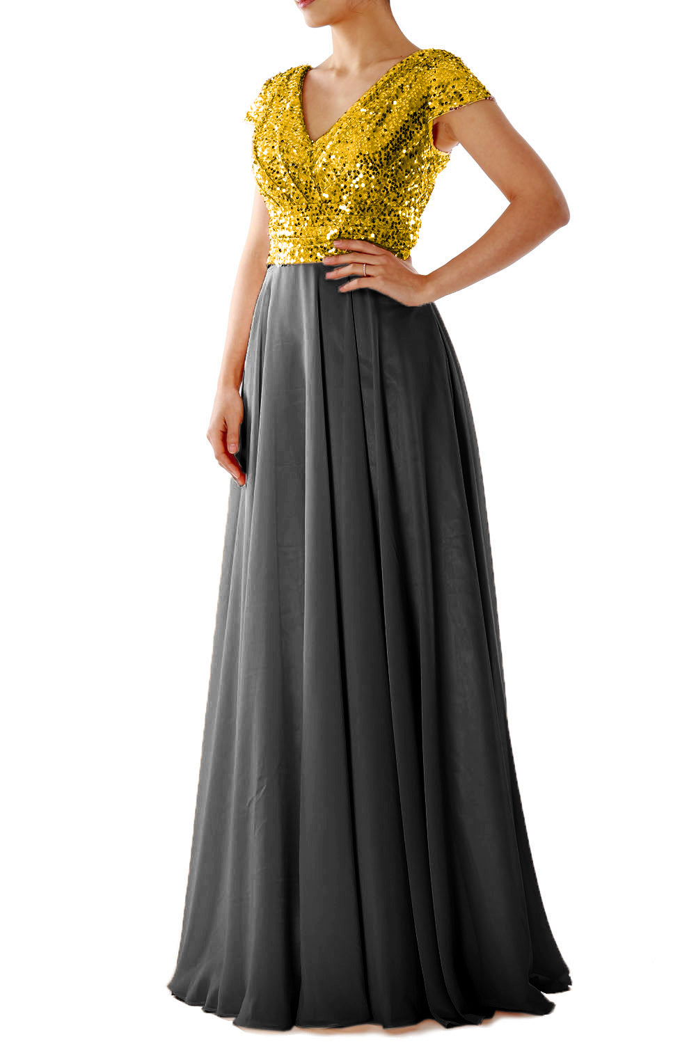 This exquisite cap sleeved V-neck dress is perfect for any special occasion. Crafted with luxurious sequin chiffon fabric, the dress features a stunning rose gold hue and a flattering fit to create a look that is both timeless and elegant.