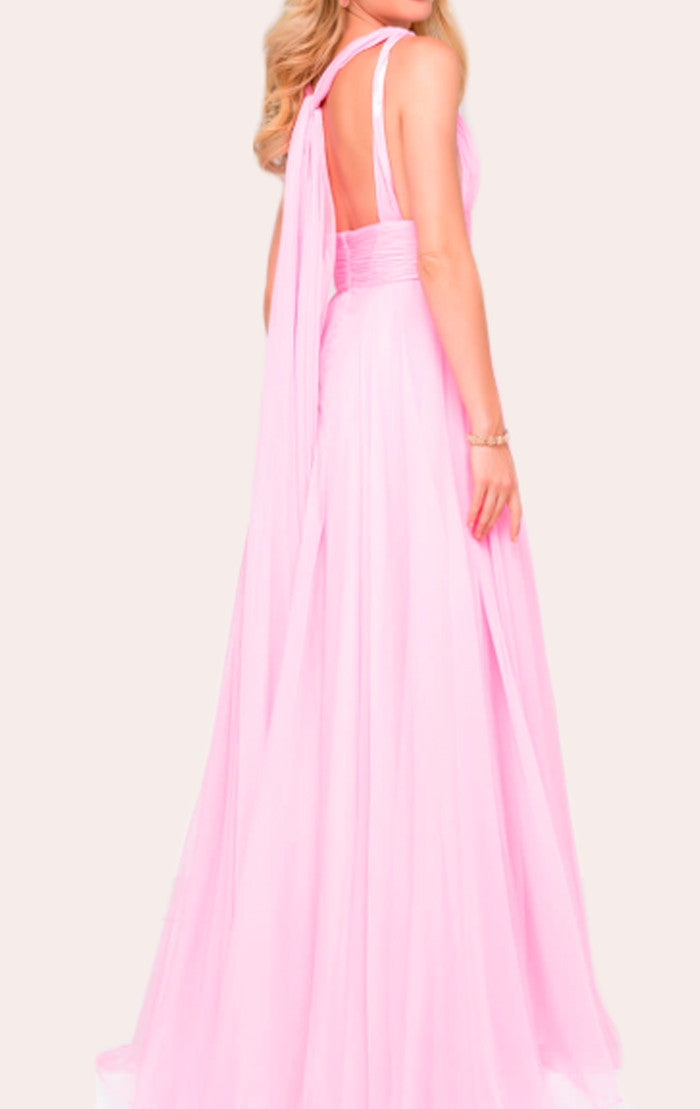 The Dress features a plunge neckline and delivers elegant sophistication for bridesmaids and prom goers alike. Crafted from lightweight chiffon and featuring classic styling, this dress is sure to turn heads.