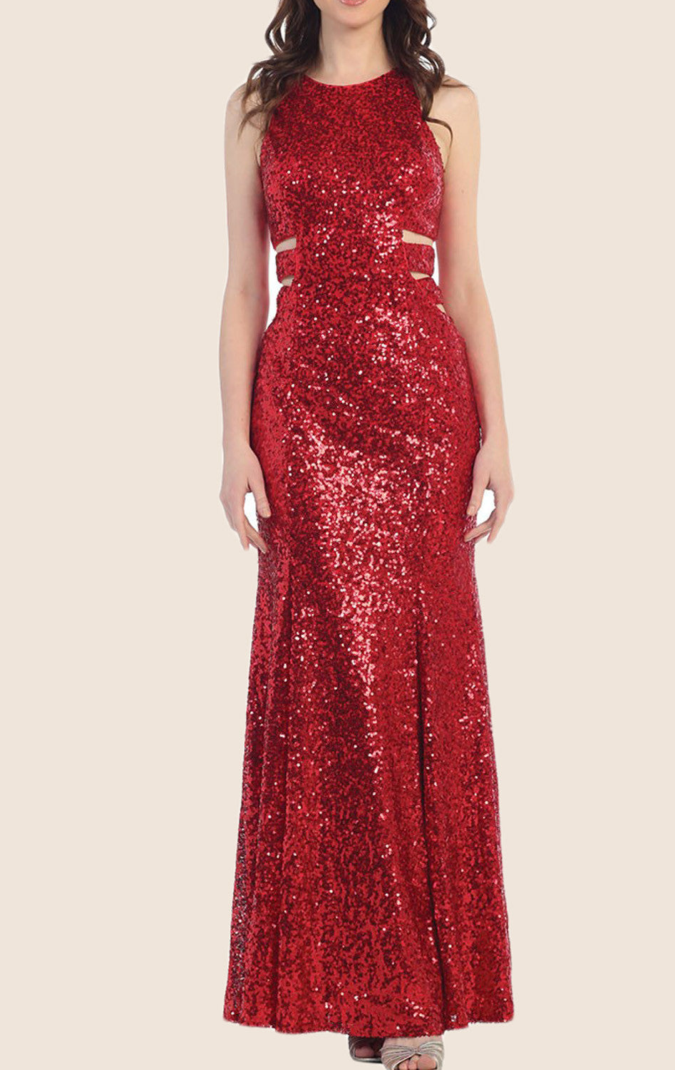 MACloth O Neck Sequin Long Prom Dress Red Formal Gown