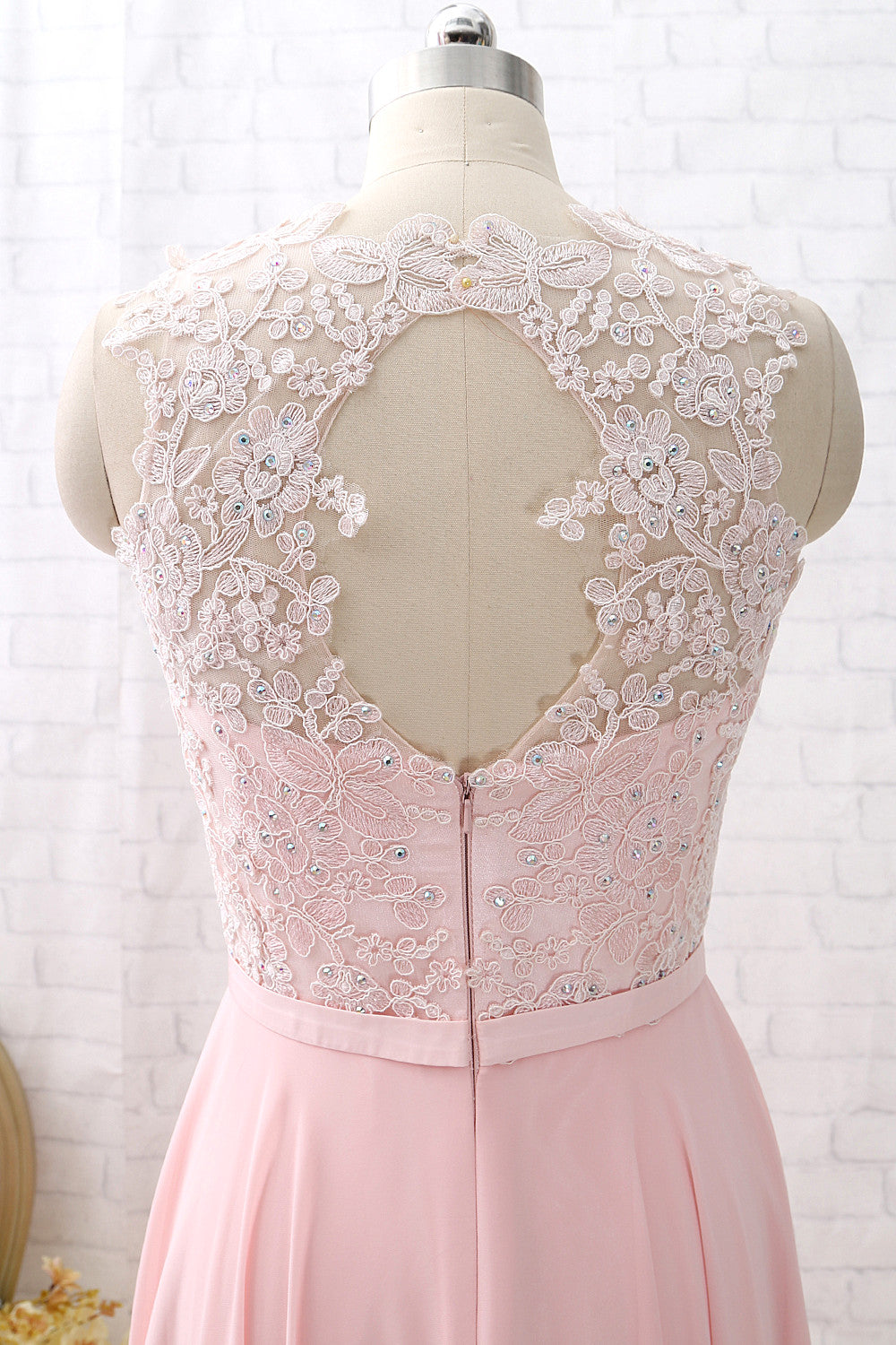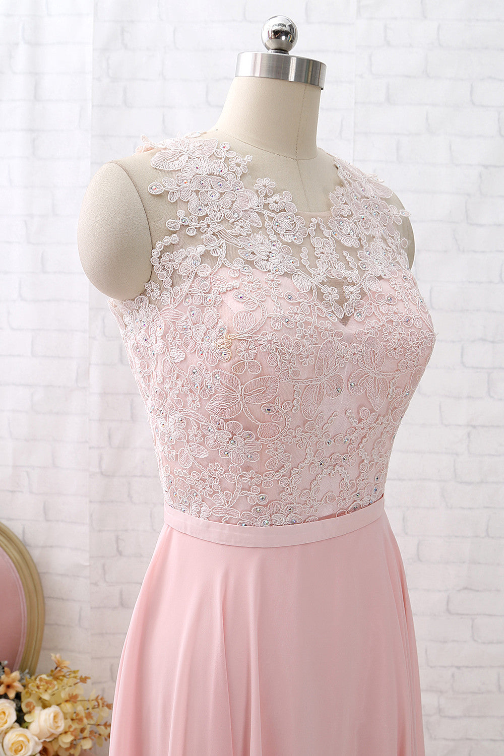 MACloth Straps O Neck Lace Chiffon Long Bridesmaid Dress Pink Formal Party Dress