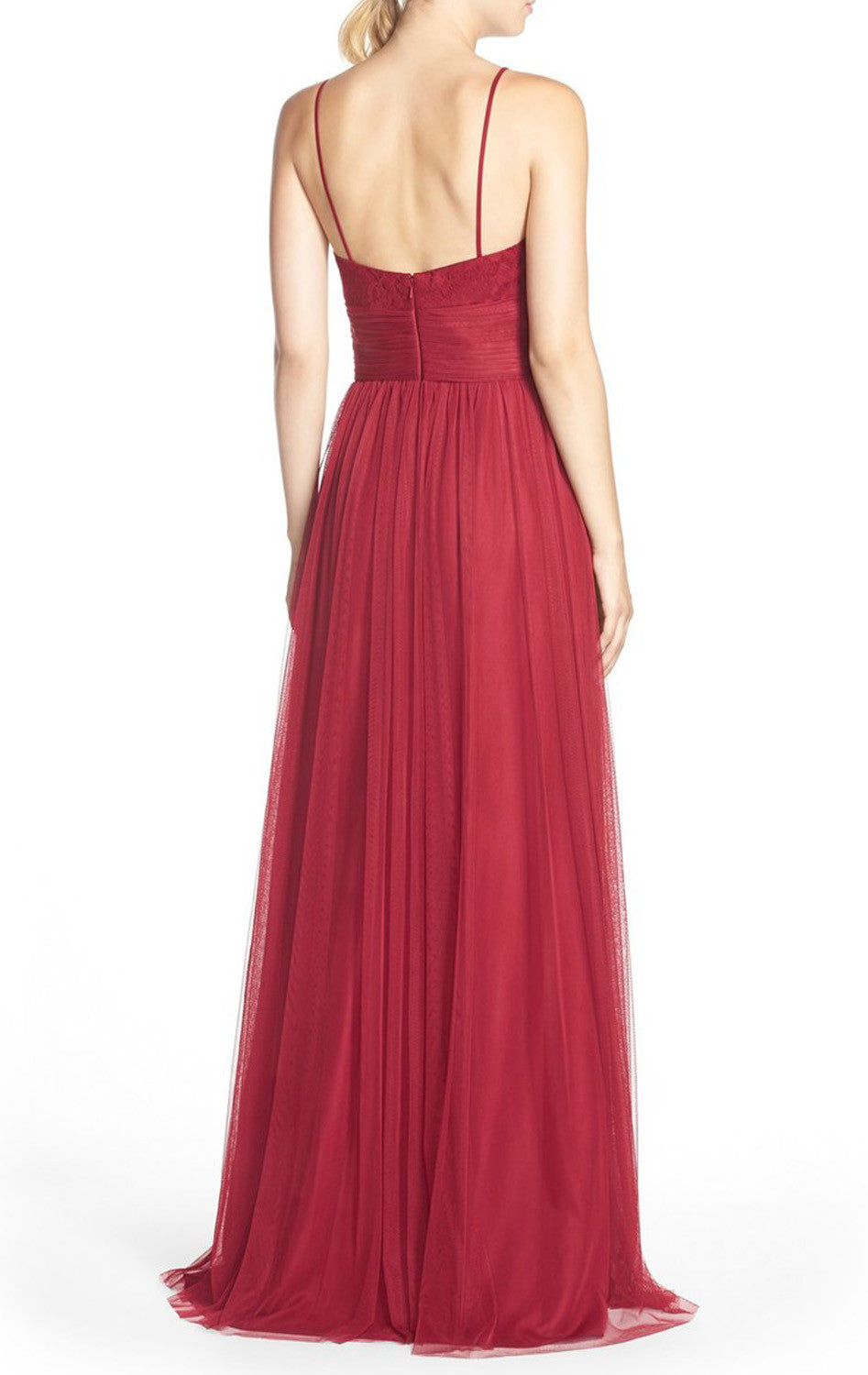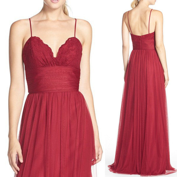 MACloth Straps V Neck Lace Tulle Long Bridesmaid Dress Red Formal Gown