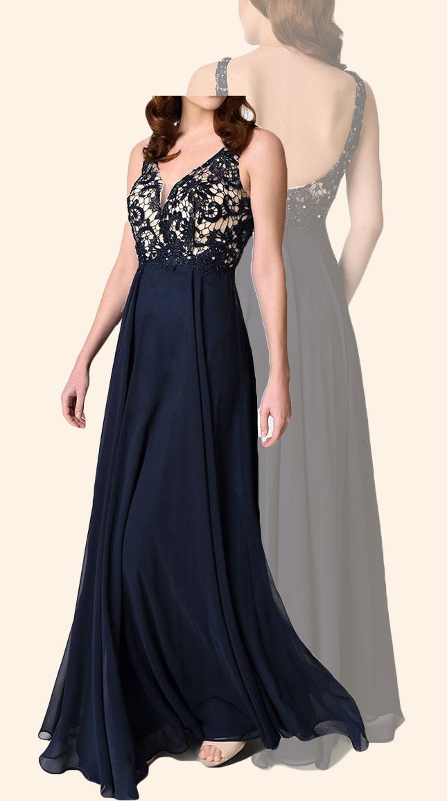 MACloth V Neck Lace Chiffon Long Bridesmaid Dress Dark Navy Simple Prom Gown